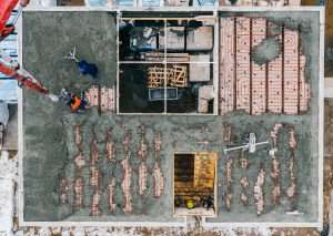 Aerial view of workers pouring a wet concrete at floor heating system installation in new house construction site